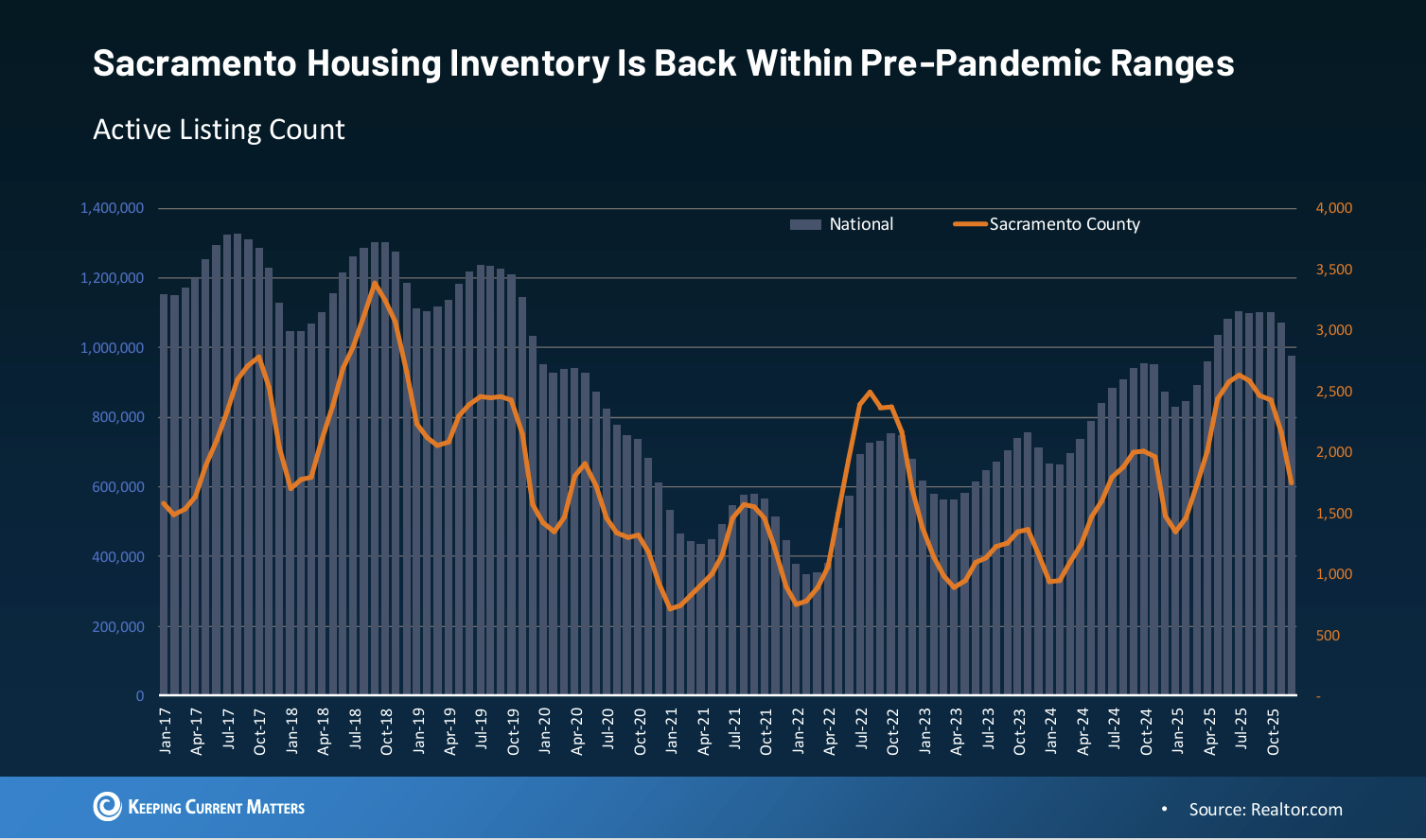 Sacramento housing inventory has climbed back into pre-pandemic ranges. That doesn’t mean we’re flooded with listings. It means we’re functioning again.